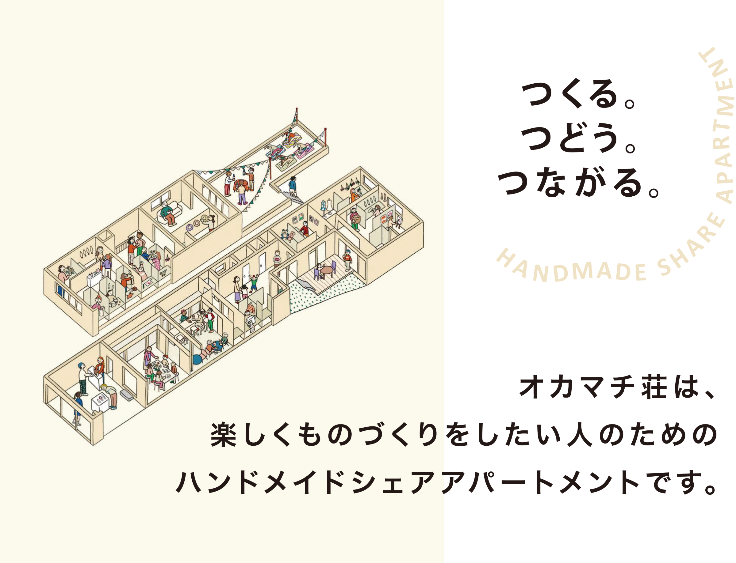 『オカマチ荘』は、もとは化粧品店だった古家をリノベーションして生まれた、楽しくものづくりをしたいハンドメイド作家やクリエイターのためのシェアアトリエです。